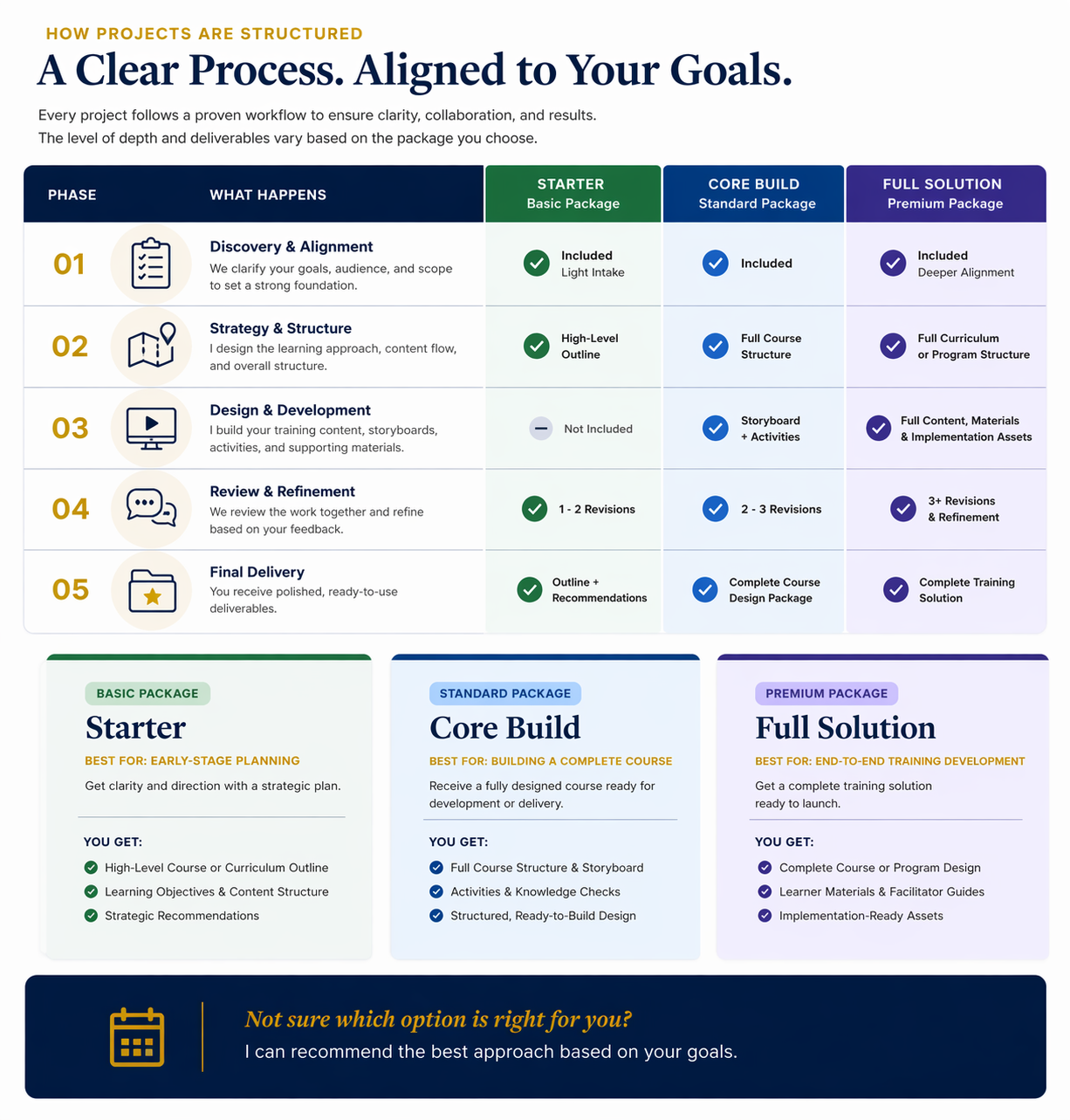 I offer learning design and training solutions that help organizations build structured, scalable, and effective learning experiences aligned to business goals.